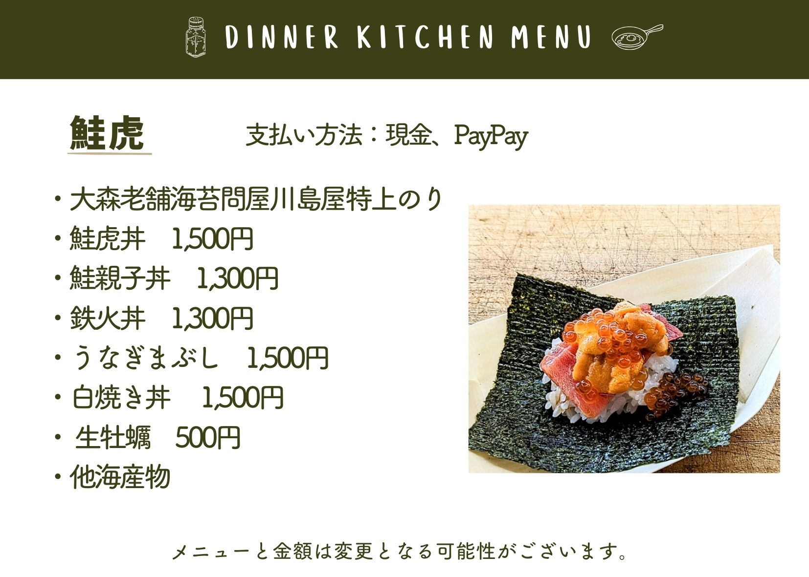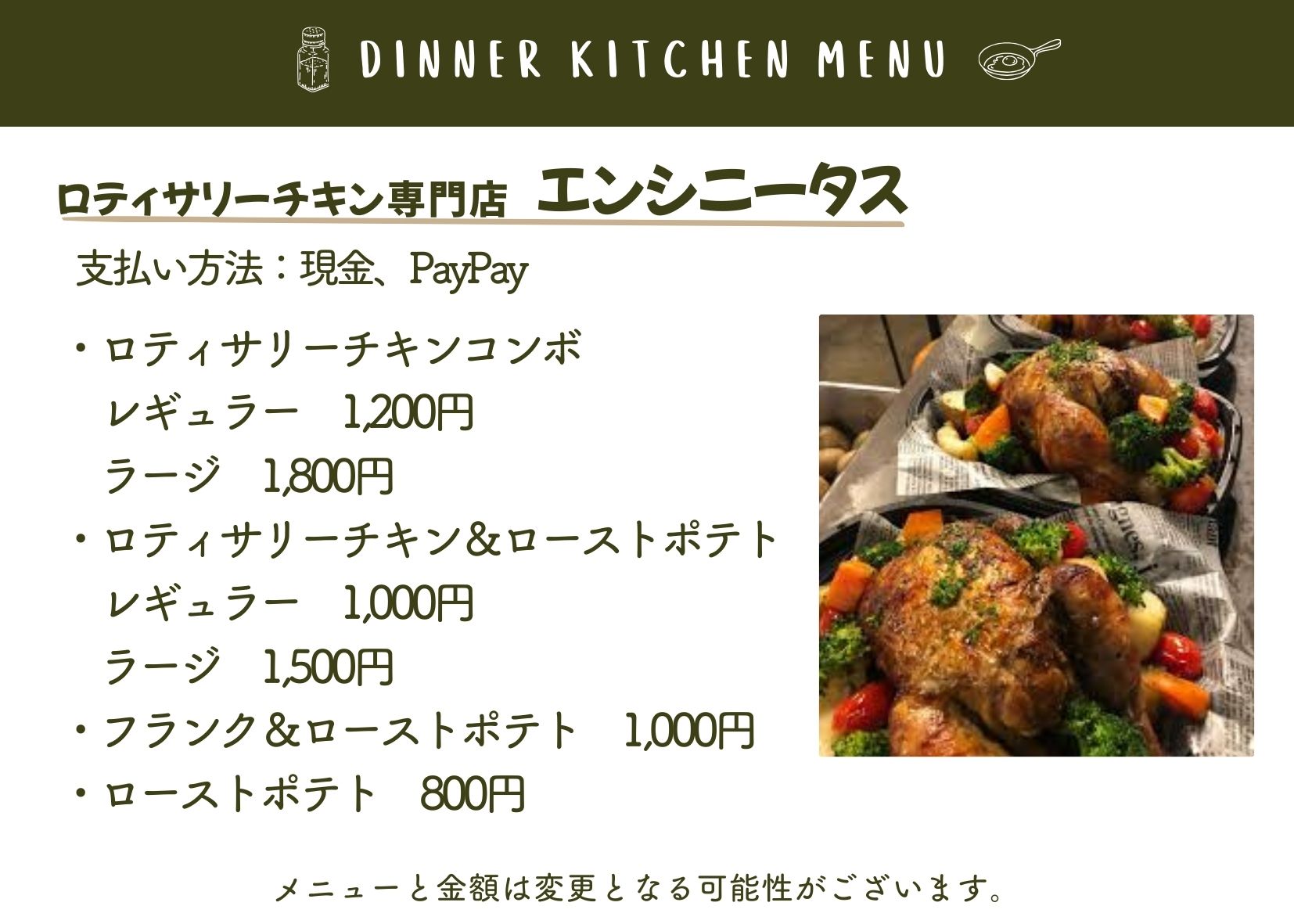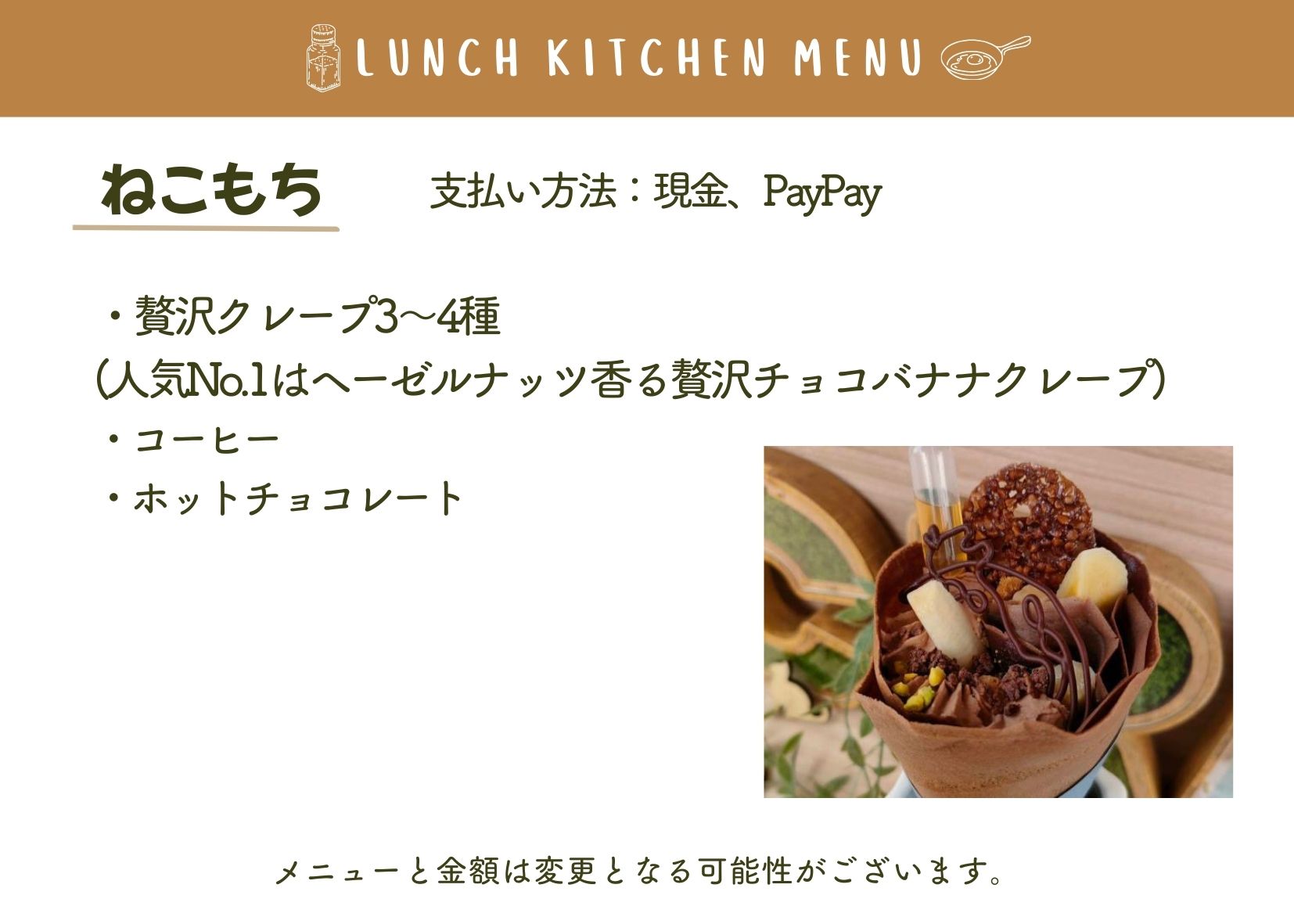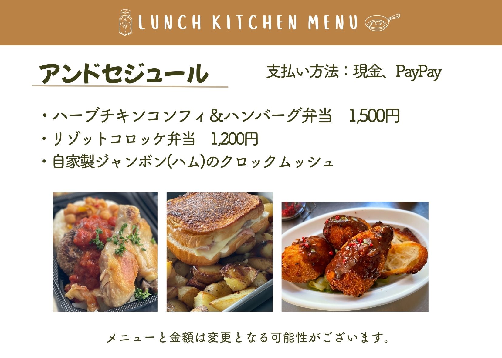 当日は、メニュー内容が変更となる場合や、売り切れにより販売できない場合がございます。